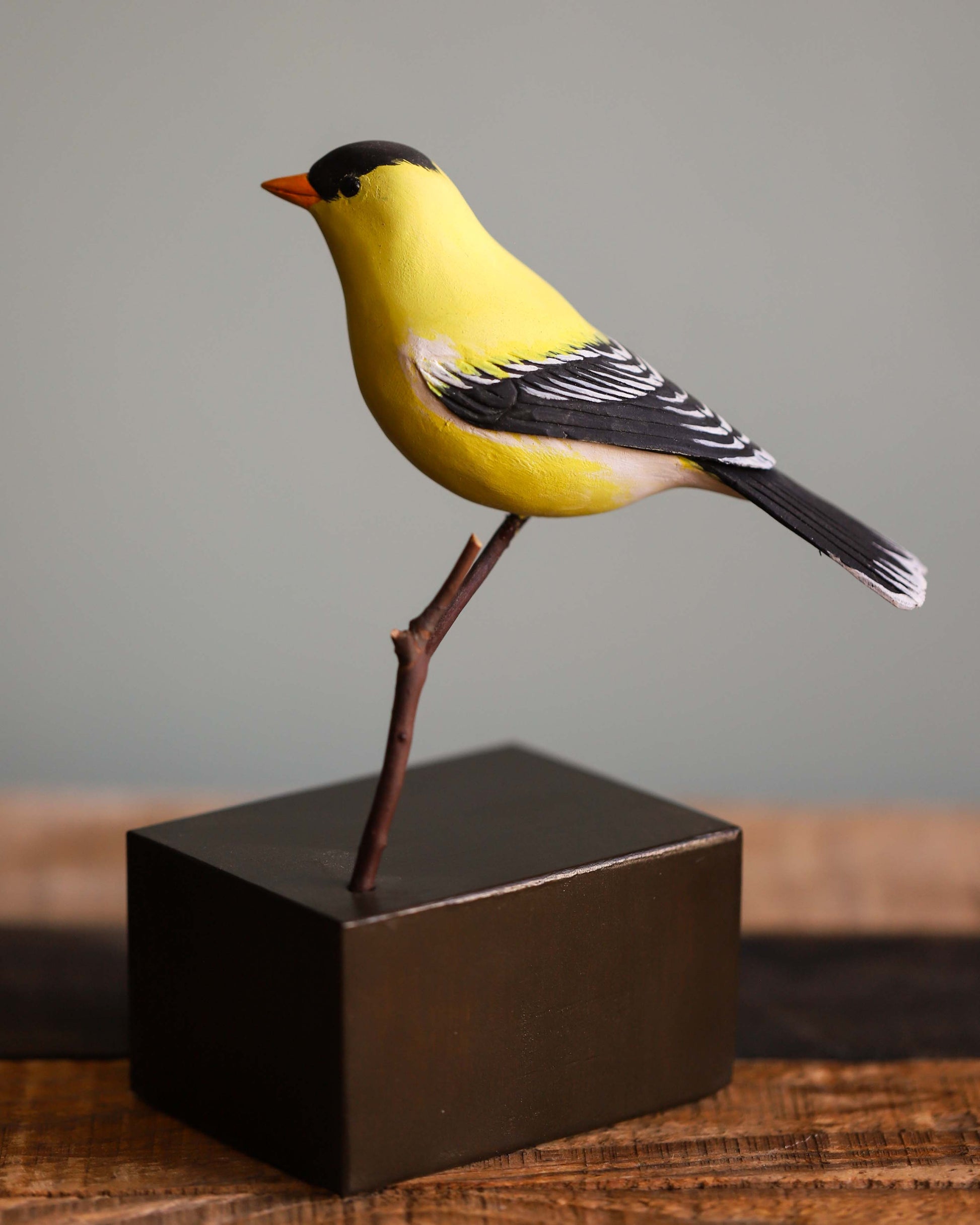 Basswood American gold finch carving perched on Arbutus branch and mounted on walnut block.