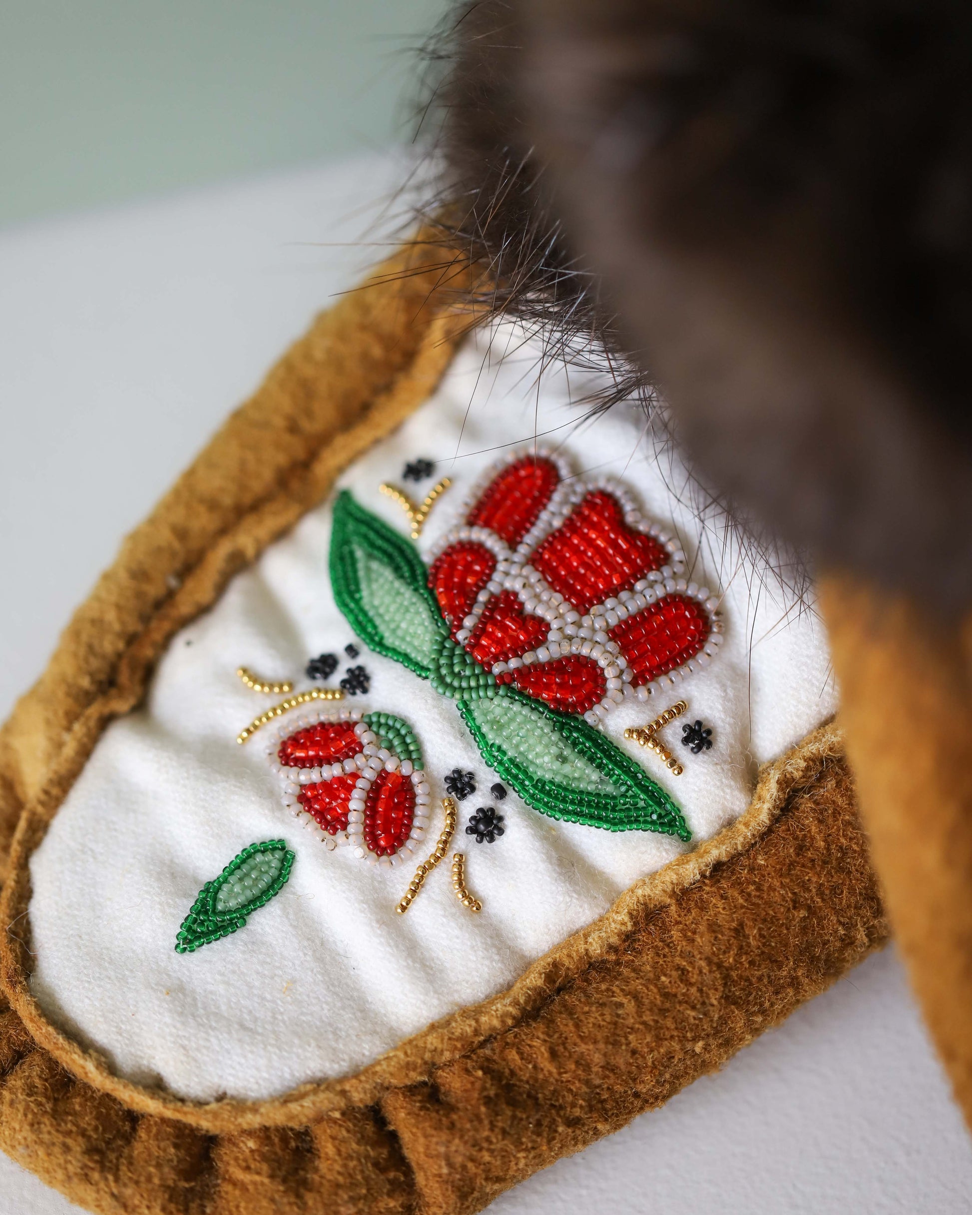 Home-tanned moose hide moccasins with beaver fur trim and red, green, and gold beadwork.