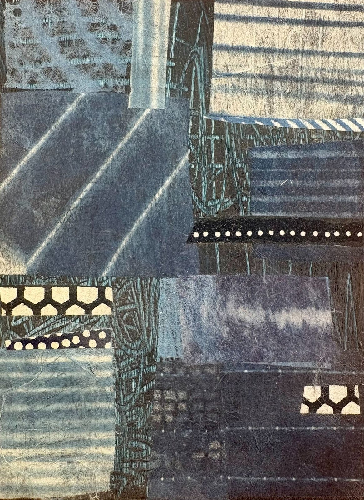 Indigo dyed and Japanese Katazome paper collage on cradled board 3x4"