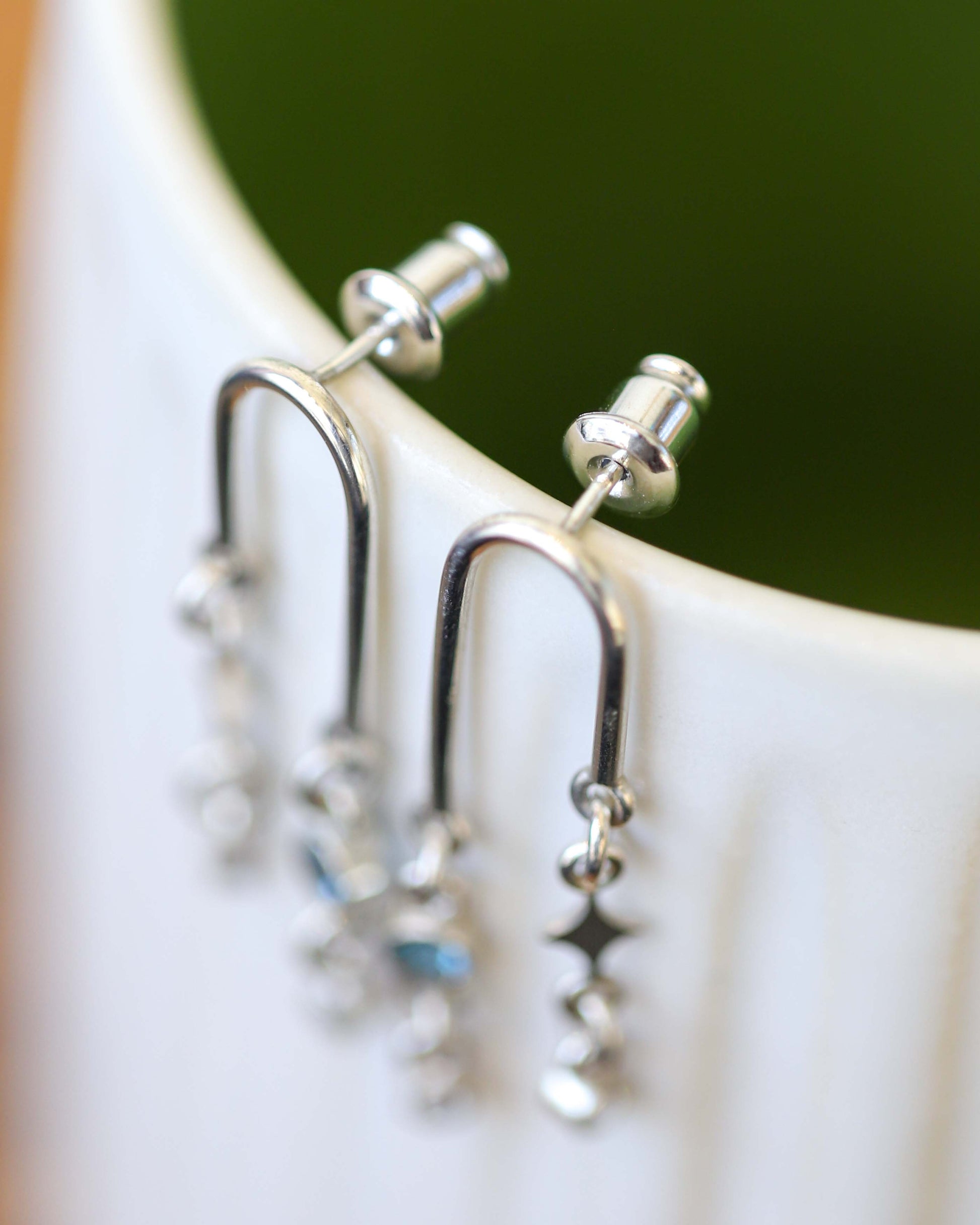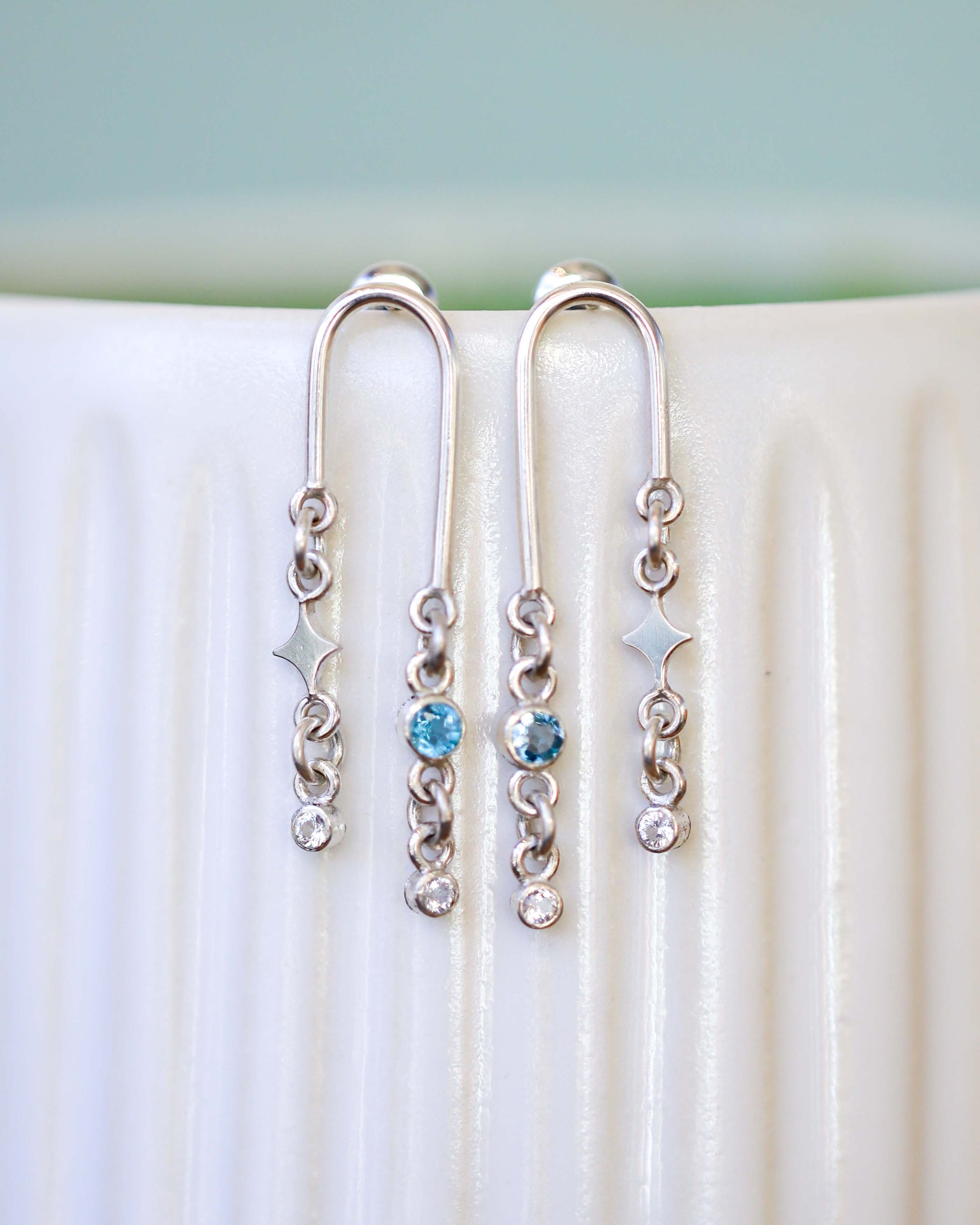 Sterling silver Celestial earrings with white and blue topaz stones. Push-back earring closures.