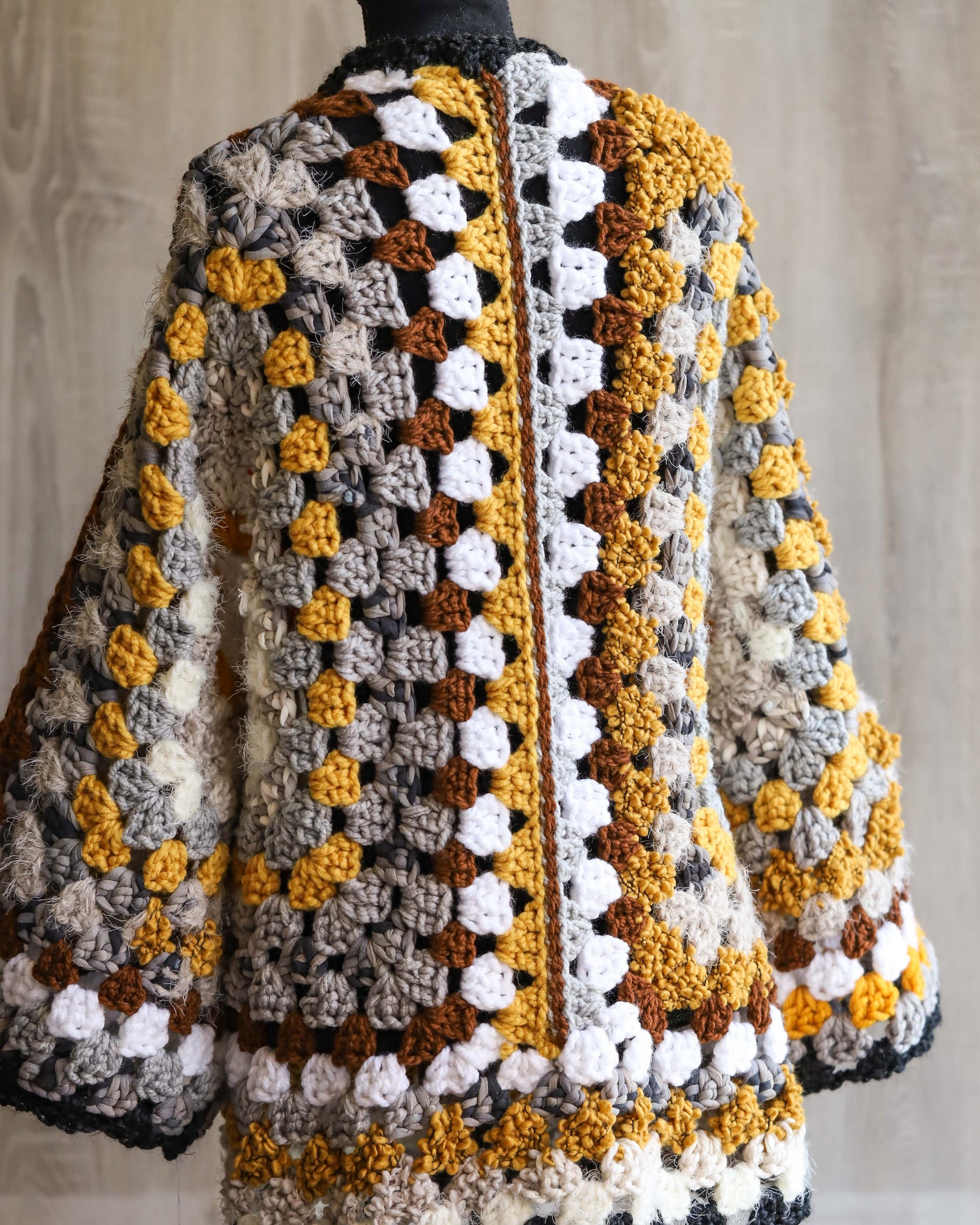 Crocheted cardigan made of various yarn in beige, brown, yellow, black, cream and grey. One size.