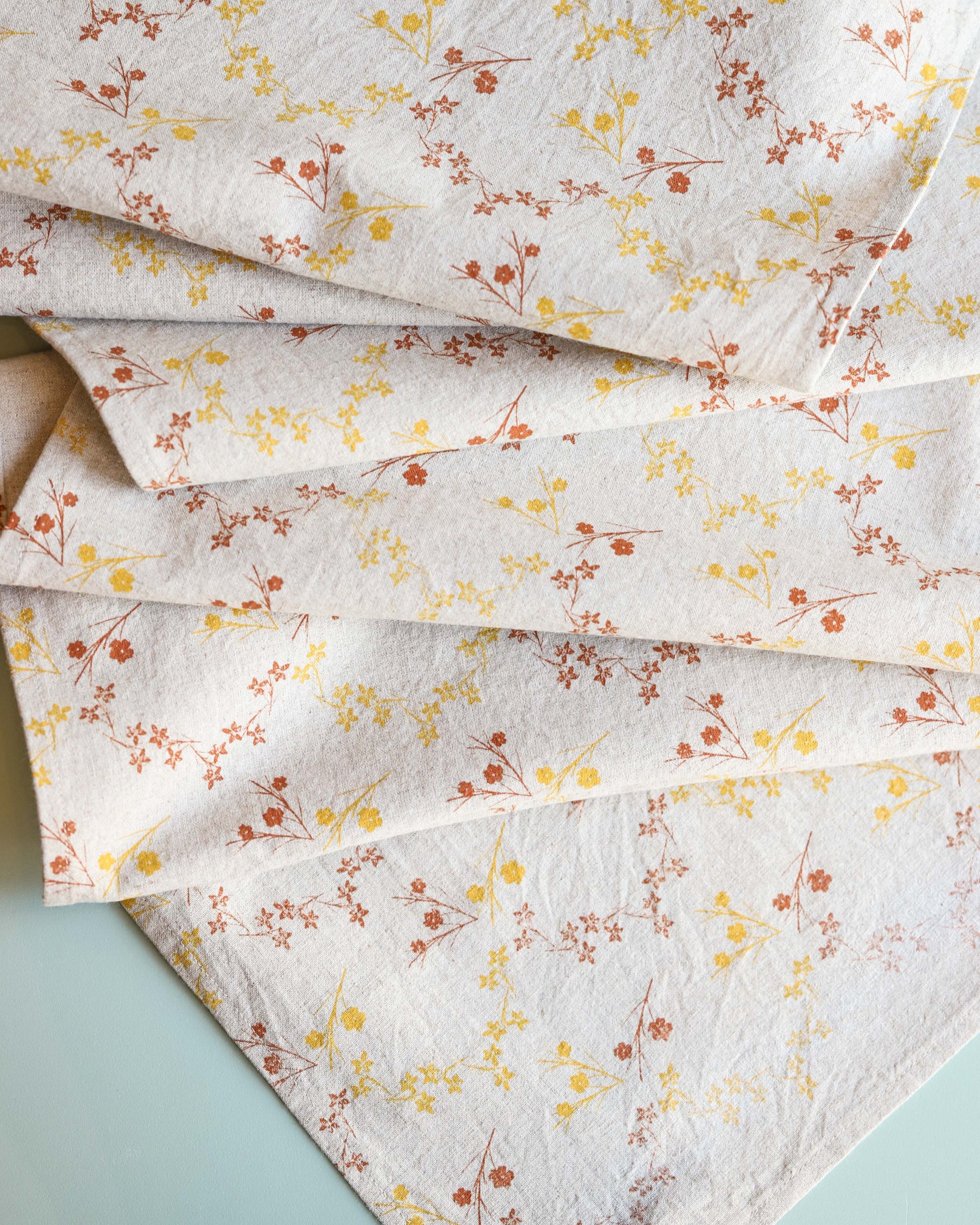 Organic linen and cotton screen printed table runner with orange and yellow floral pattern.