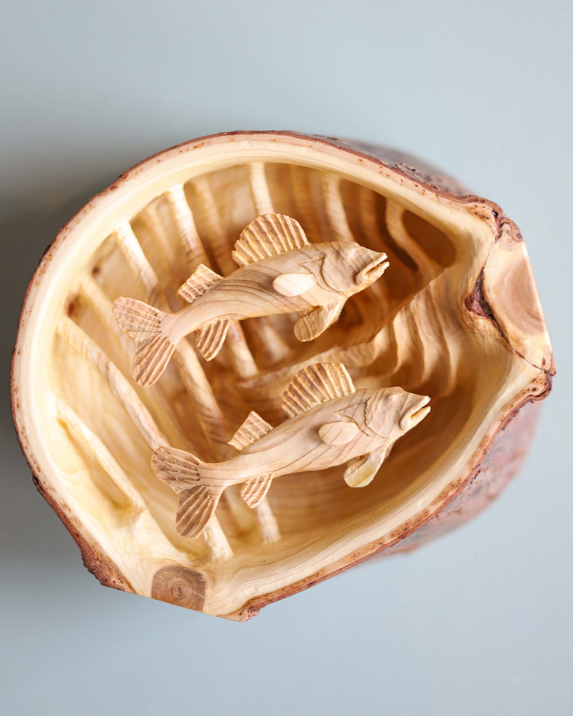 Unique wood carving wall art of fish in a log.