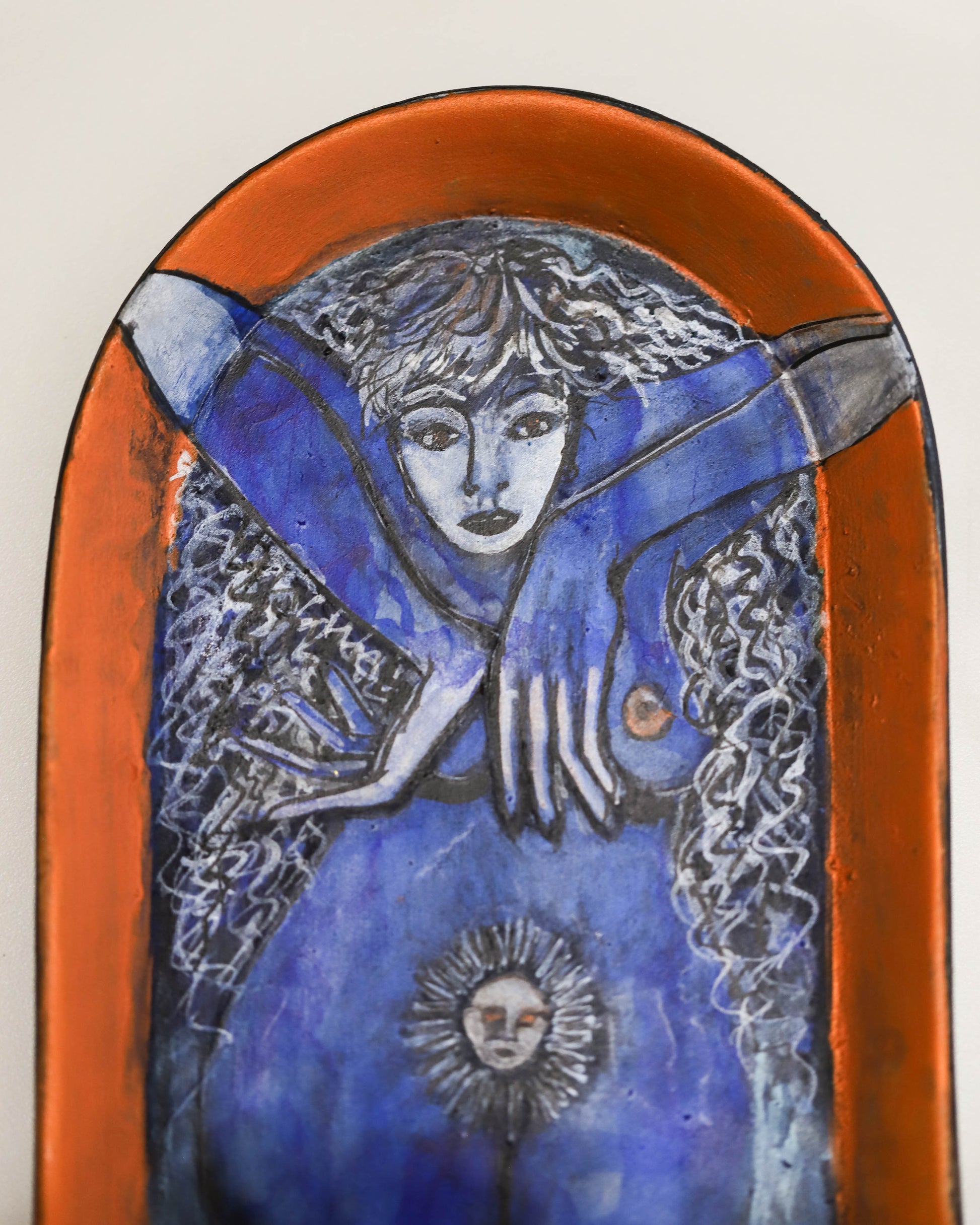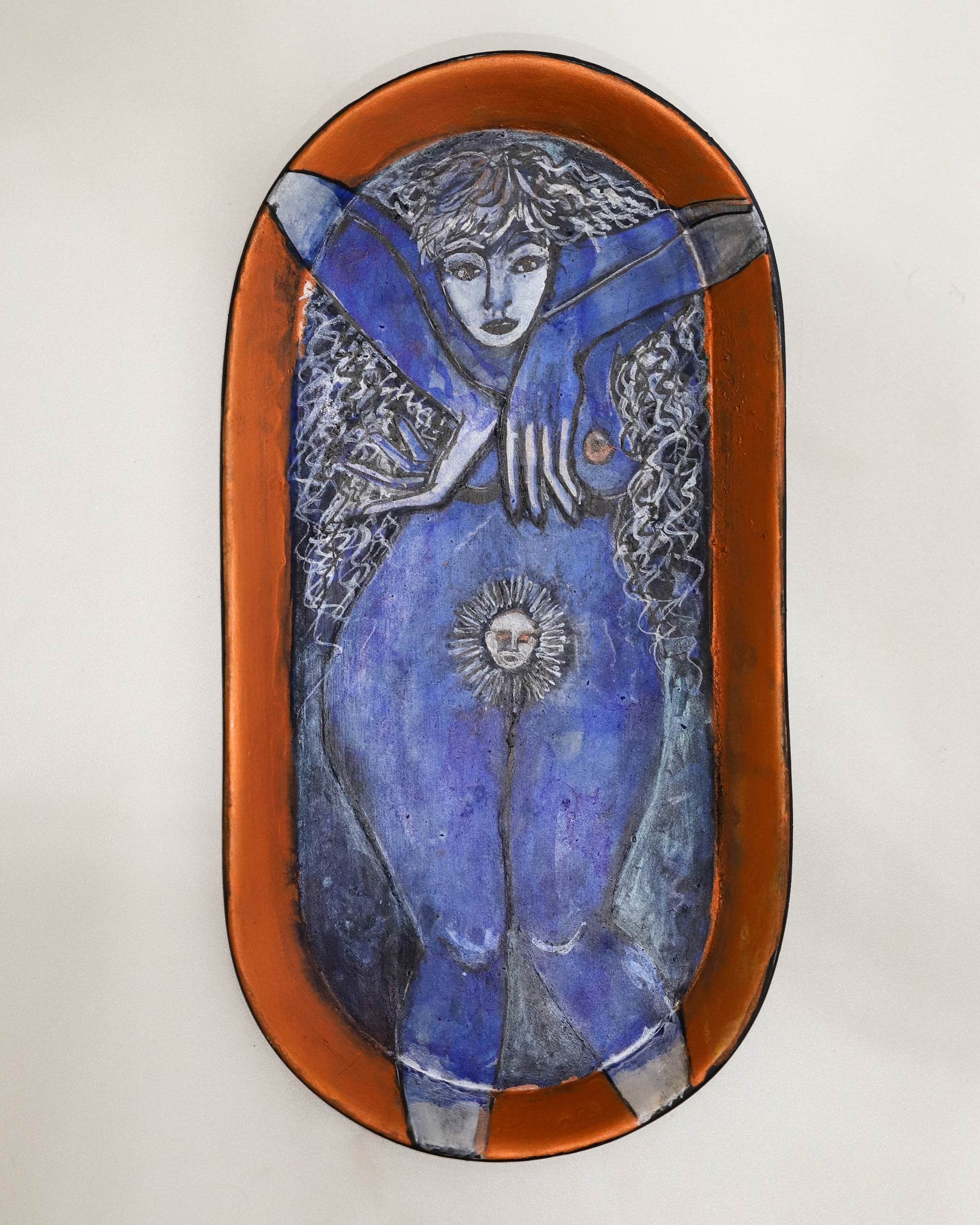 Artist: Shelley Kaszefski. Wall hanging; copper and blue with figure. Clay, underglaze pencil, acrylic inks. 18x12x4cm