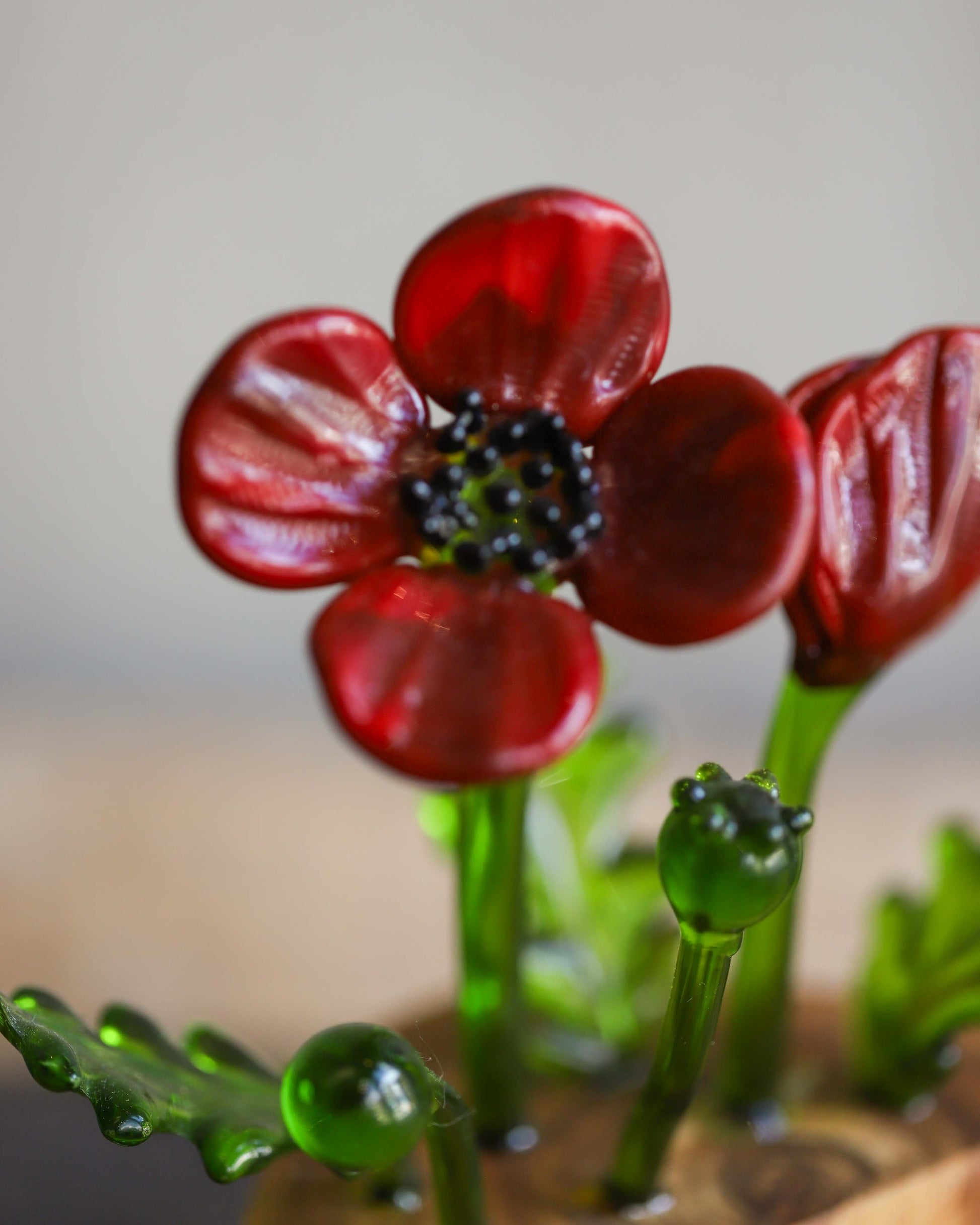 Glass poppy sculpture with one flower, one bud, and three leaves on a wood base.