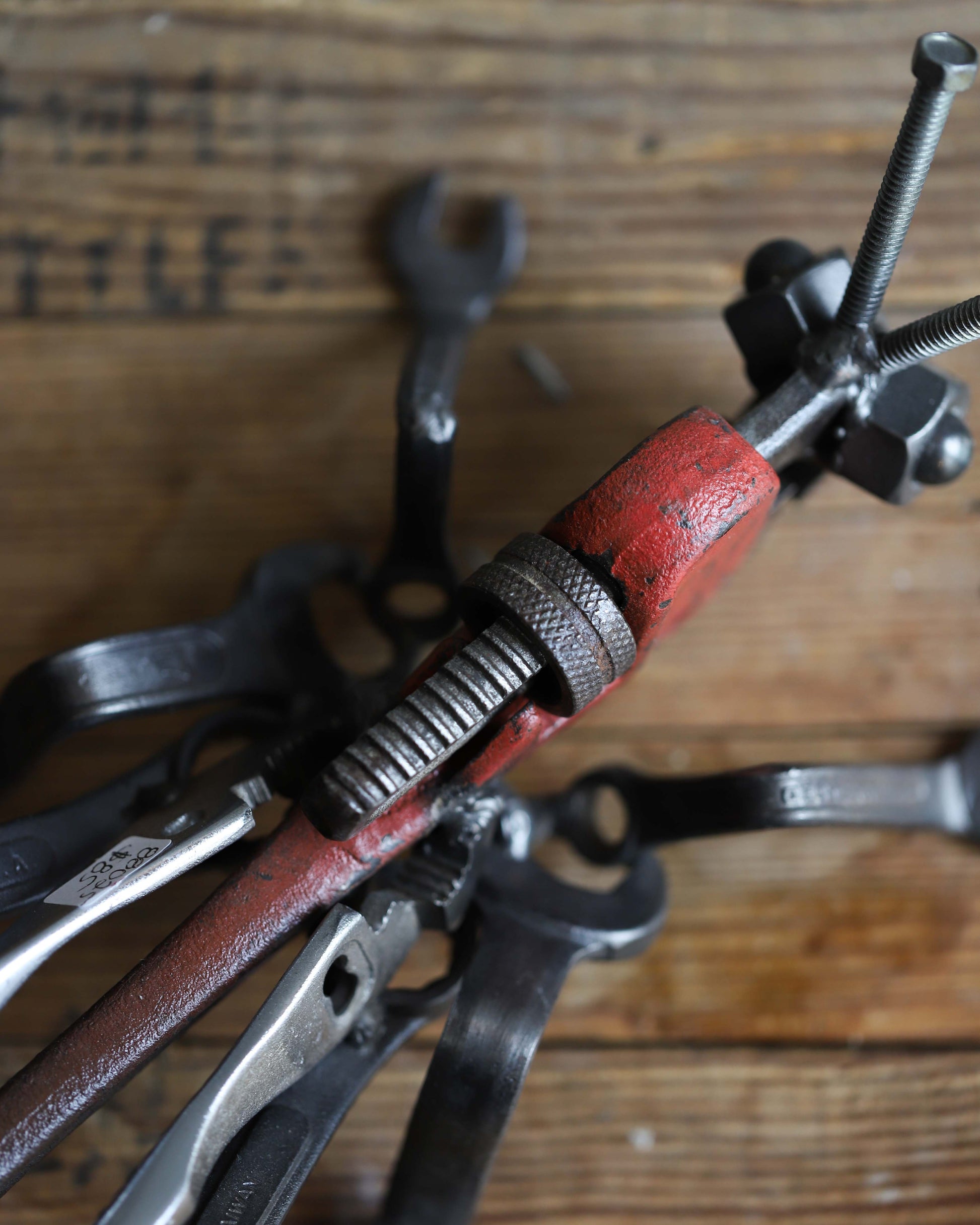 Metal grasshopper sculpture made from scrap metal, bots, and recycled tools.