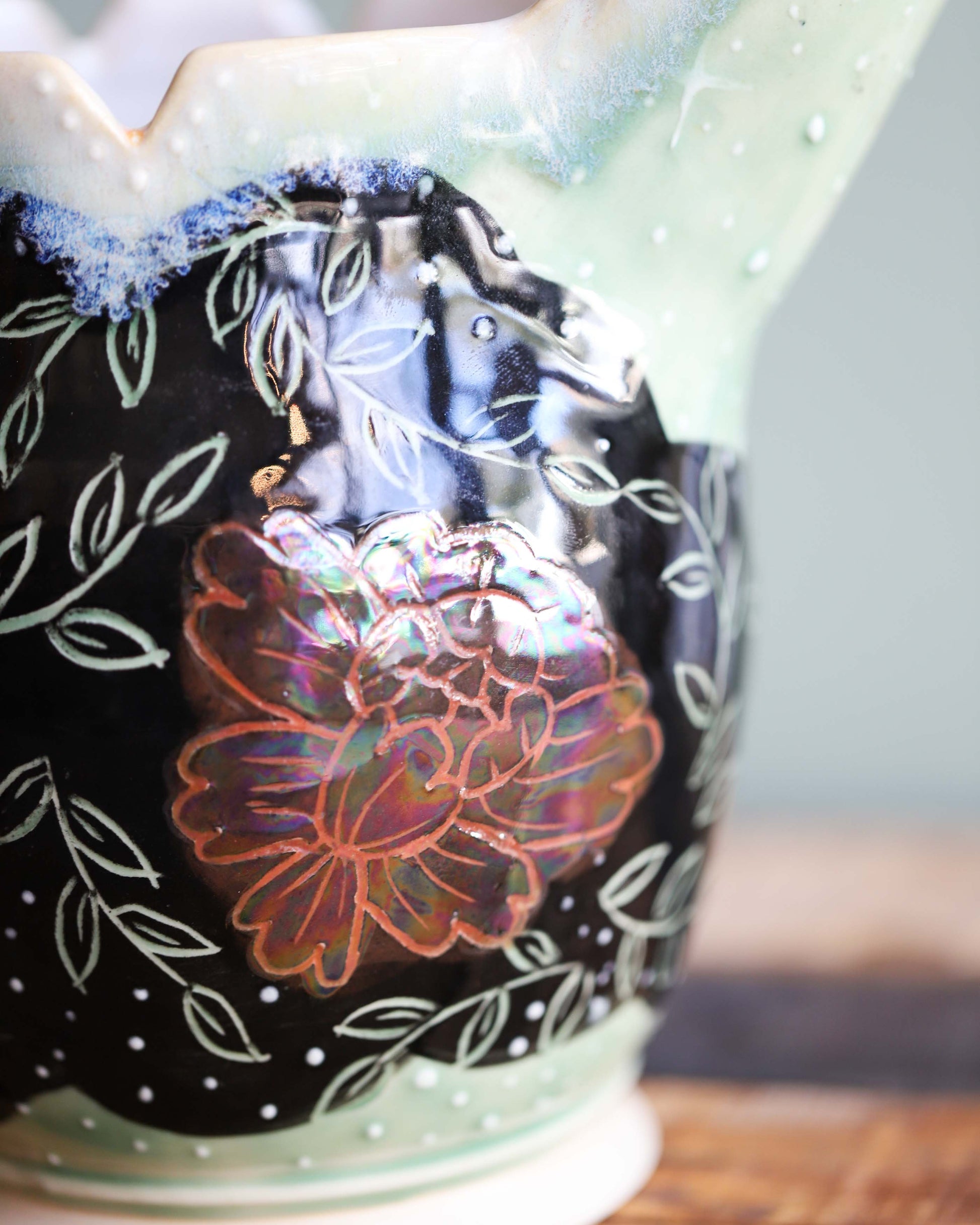 Large ceramic pitcher decorated with flowers and vintes with pearly accents.