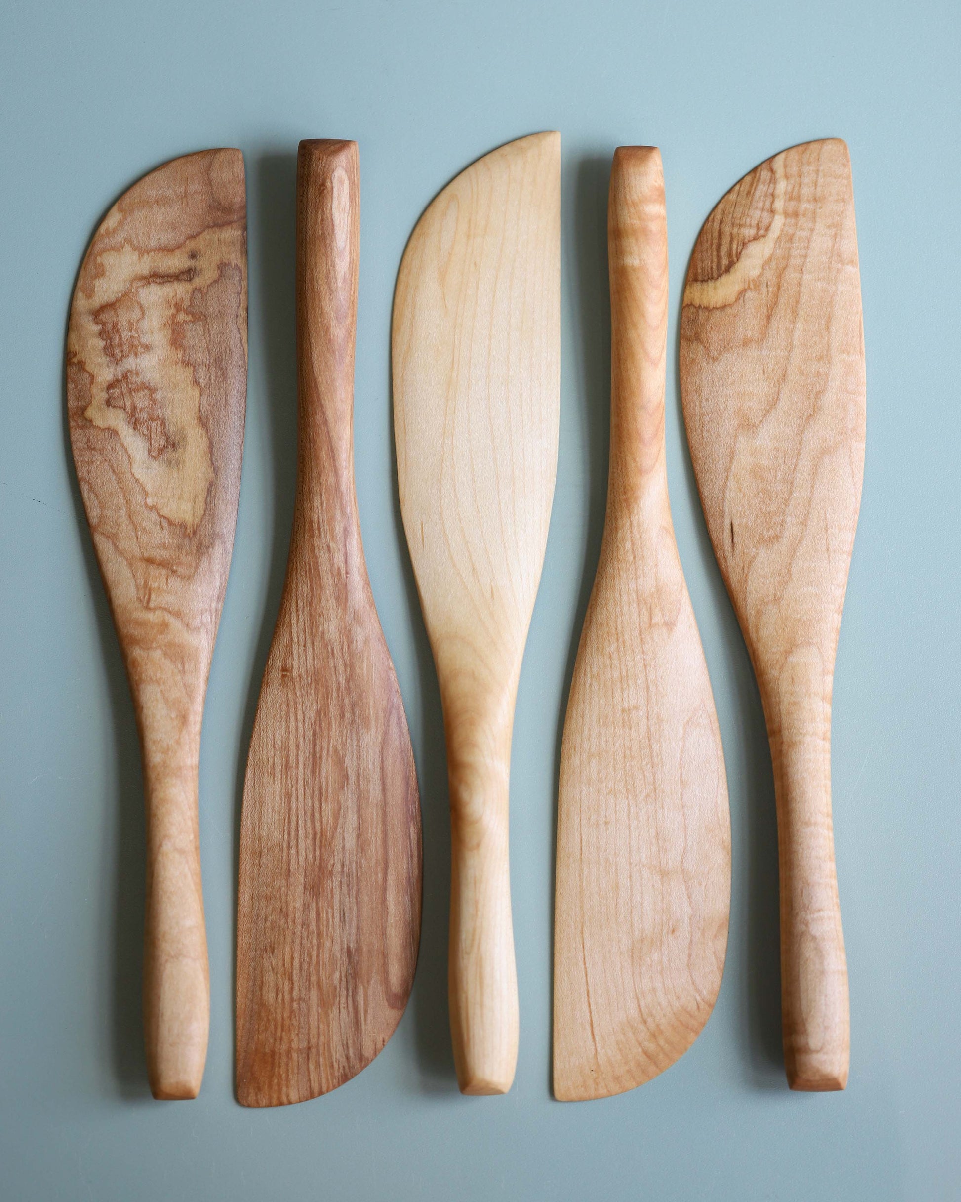 Maple wood feather-nose spatula finished with beeswax and mineral oil.