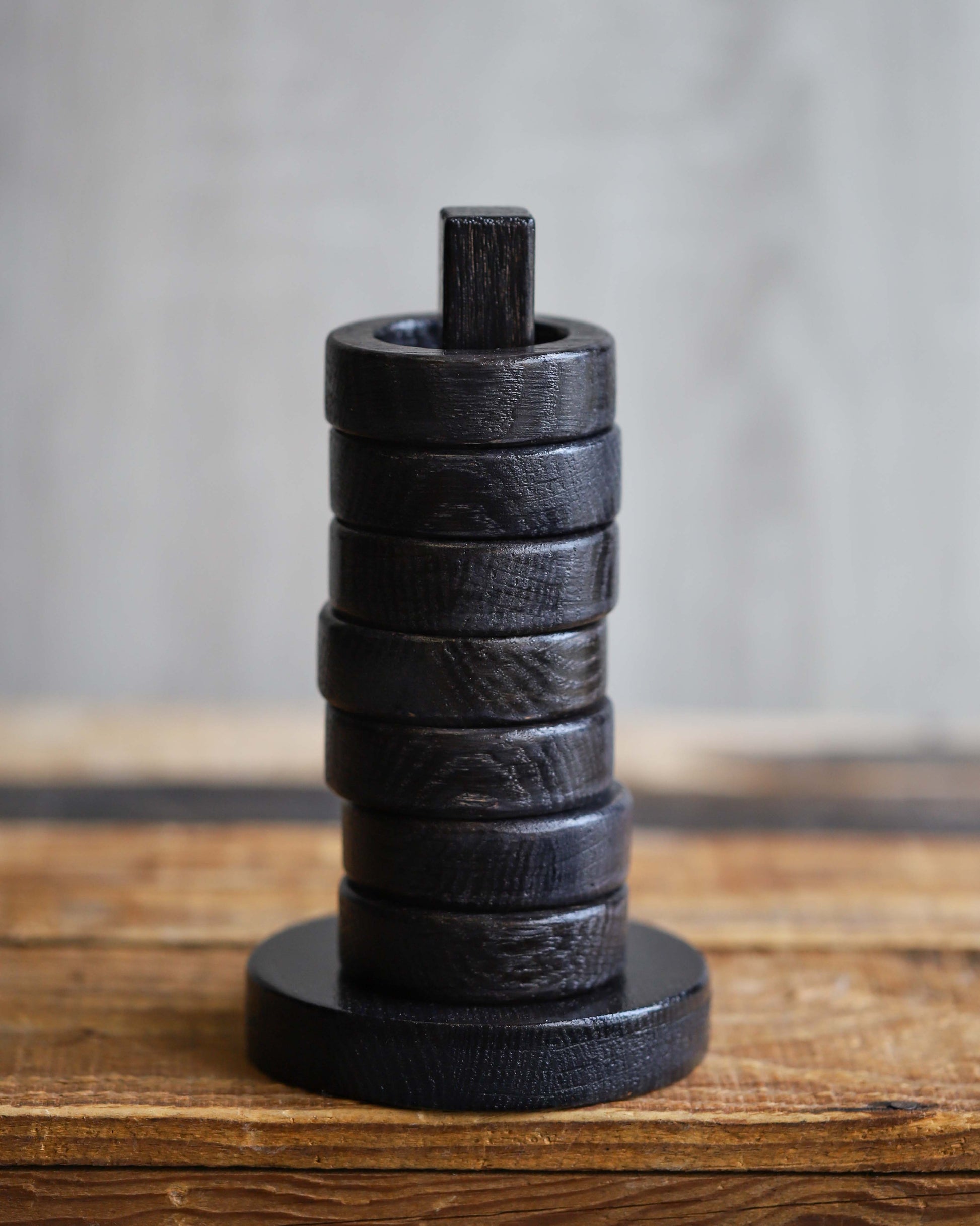 Stand is 7" tall. Each napkin ring's outer diamter is 2.25".