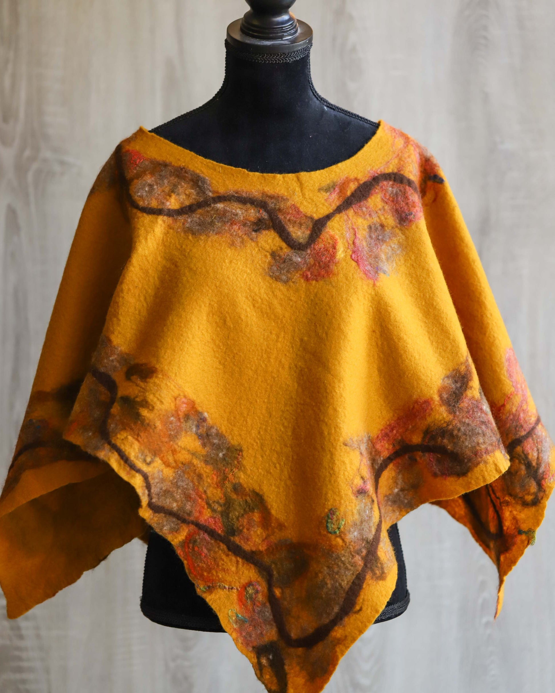 Ochre coloured poncho made with merino, alpaca, bamboo, and angelina fibres. One size.