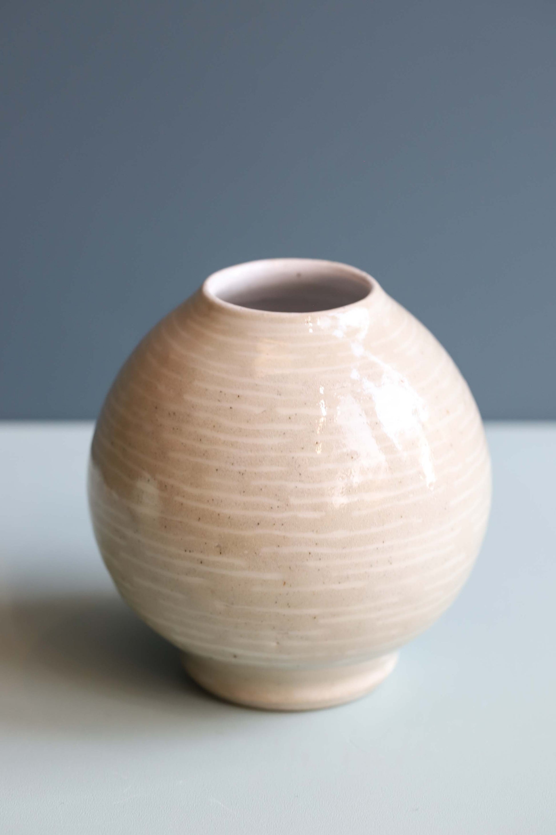 Small, round, white and beige vase with ripple pattern.